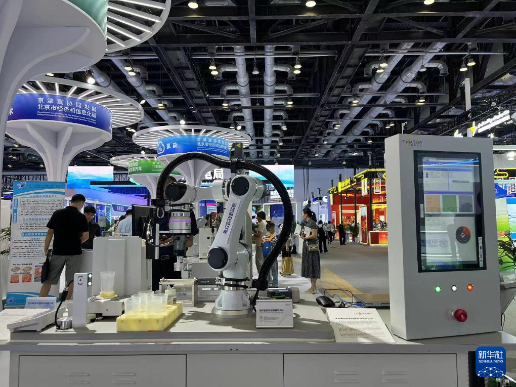 7月15日,在北京科博會(huì )上,企業(yè)展出的液體自動(dòng)精準稱(chēng)重機器人。新華社記者 陽(yáng)娜 攝
