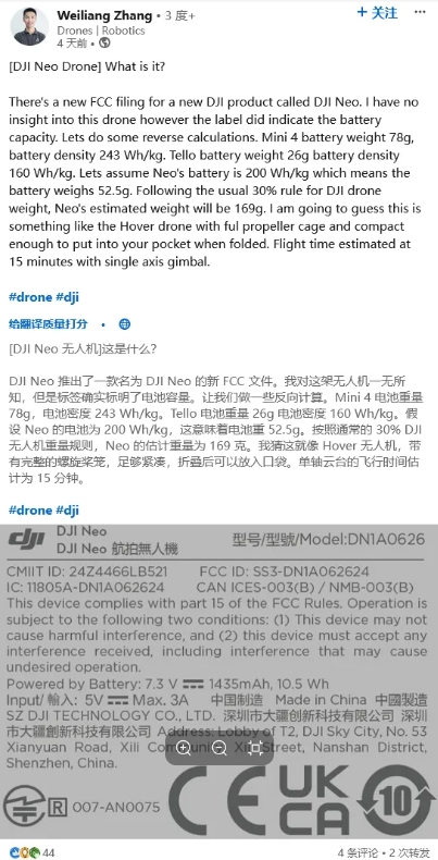 無(wú)人機業(yè)內人士 Weiliang Zhang 在其 LinkedIn 賬號發(fā)布動(dòng)態(tài),基于 FCC 認證文件信息,基于大疆 Mini 4(電池重量 78 克,電池密度 243 Wh/kg)、大疆 Tello(電池重量 26 克,電池密度 160 Wh/kg),推測大疆 Neo 無(wú)人機的電池重量為 52.5 克,密度為 200 Wh/kg。