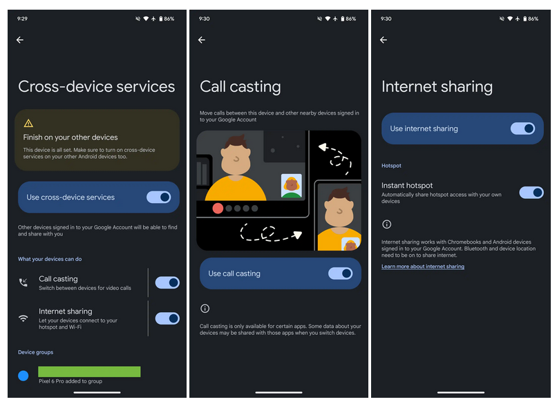 啟用方式:用戶(hù)打開(kāi)設置 > Google > 設備和共享 > 跨設備服務(wù),在設置過(guò)程中需要在已登錄賬號設備上啟用相關(guān)選項,從而建立“設備組”。