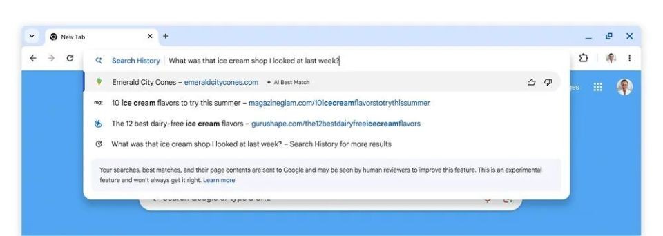 例如“上周我看的那家冰淇淋店是哪家?”,Chrome 瀏覽器會(huì )顯示瀏覽歷史記錄中的相關(guān)頁(yè)面。
